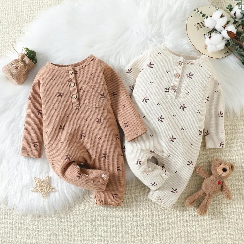 Macacão longo em algodão, com estampa digital de folhinhas delicadas 🌿✨. Em tom nude, traz um estilo minimalista com uma pegada retrô encantadora. Macio, confortável e cheio de charme para os momentos do seu bebê 👶💕.